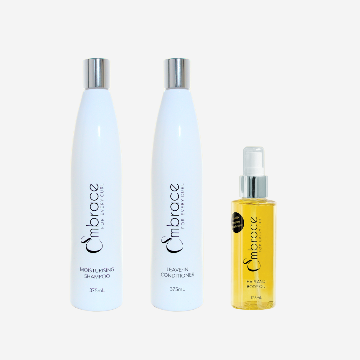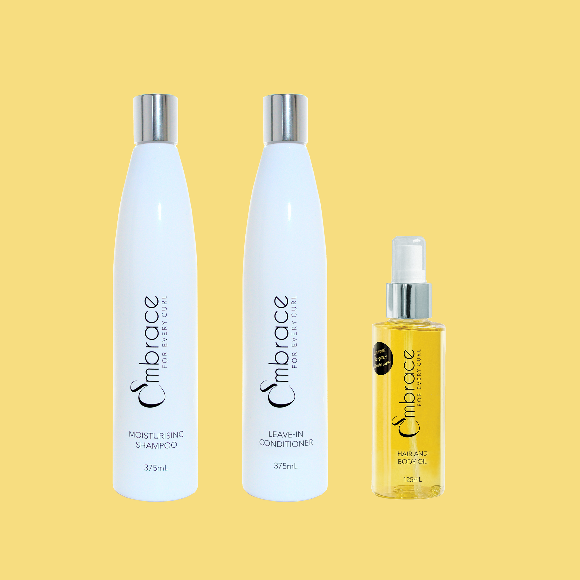 Embrace for Every Curl Hair & Body Oil is amazing for adding shine and locking in moisture to your curls without weighing them down. Our lightweight, non-greasy and easily absorbed formula is also great for use as a daily moisturiser for the face and body.